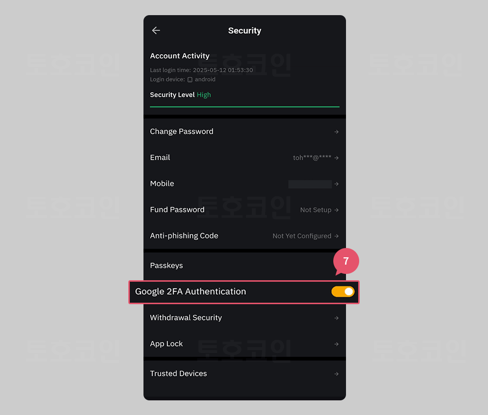 7. Google 2FA Authentication 우측 스위치가 ON이 되었다면 OTP연동이 완료 되었습니다.