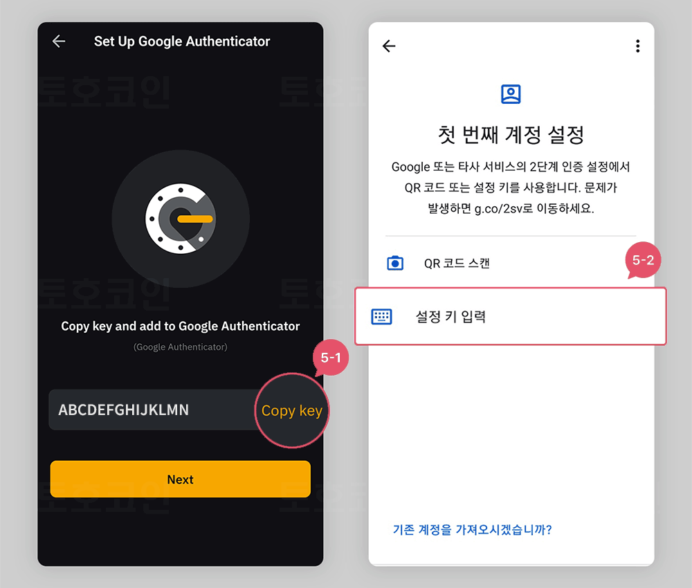 인증 앱으로 다시 돌아가서 5-2. 설정 키 입력을 클릭해 줍니다.