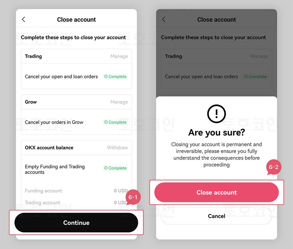 6단계. 계정삭제를 위해 모든 포지션 종료및 모든 자산을 이동해 줍니다.